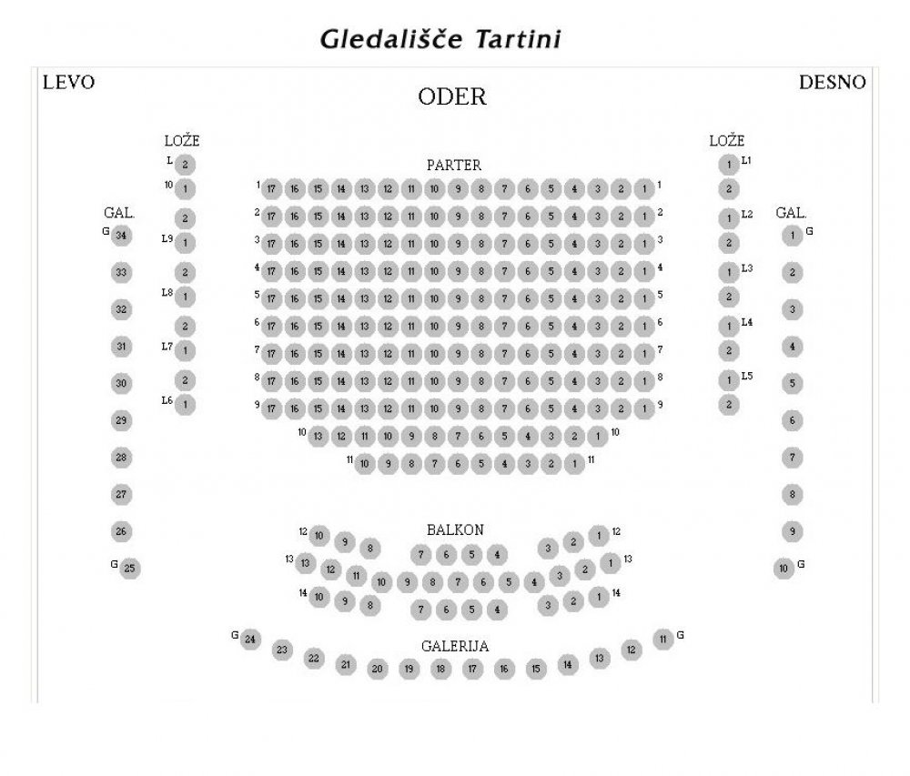 Oder meri 80 m2, portalna odprtina odra pa 7 m. V parterju dvorane je nameščenih 180 sedežev, na balkonu, v ložah in na galeriji pa še 80 sedežev. Sedišč je tako skupaj 260.